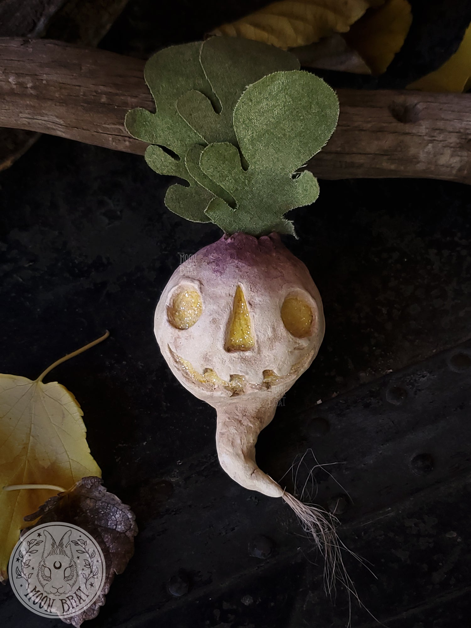 A one of a kind turnip lantern that will never rot; it will light your way eternally, just as Stingy Jack's does while he wanders between this world and the next... This art doll was inspired by the original jack o' lantern, the Irish turnip!